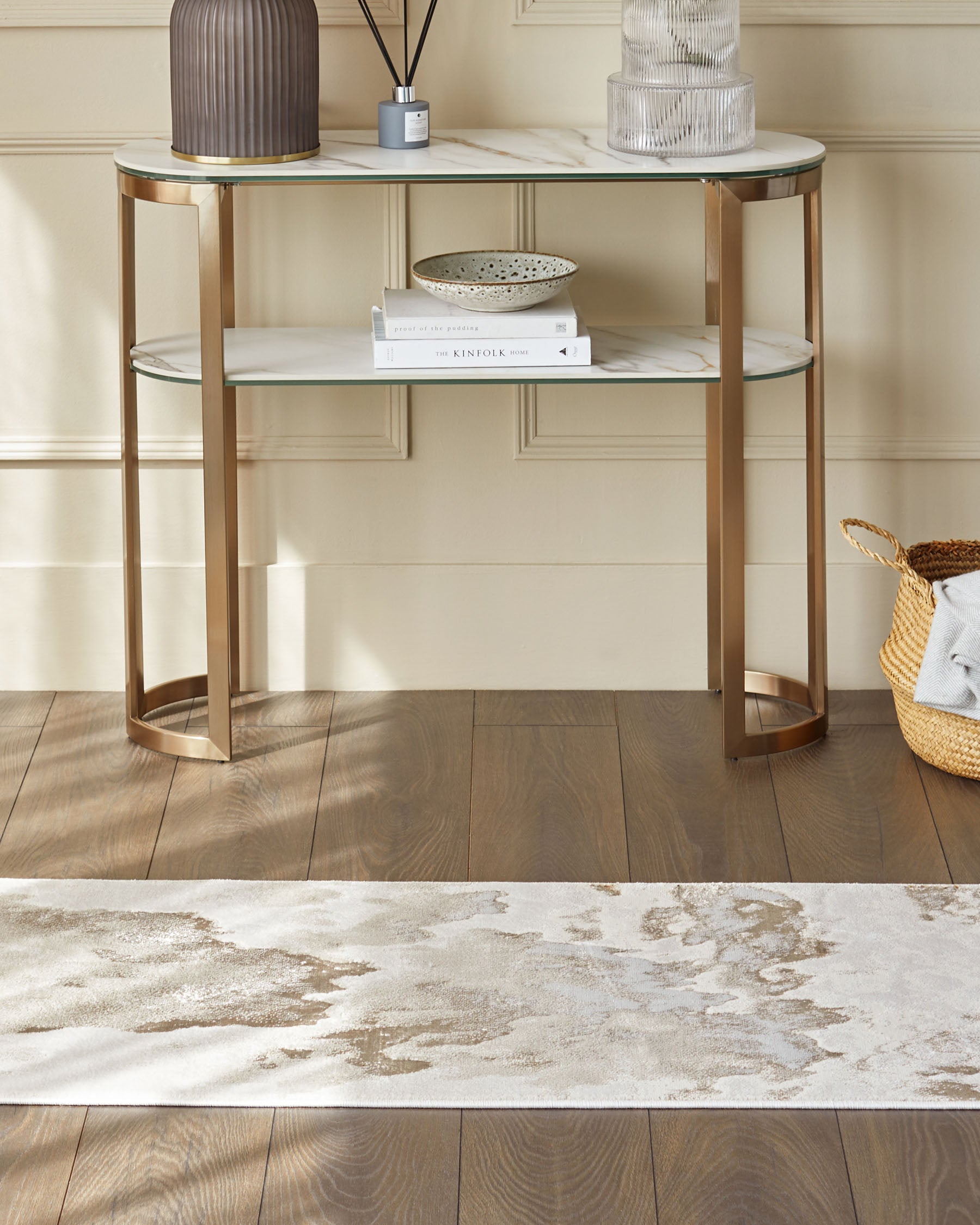 Transform your hallway or living space with the Perla soft gold textured runner rug. Its lustrous yarn creates a captivating shimmer that catches the light beautifully, while the marbled watercolour effect adds artistic depth to any room. Perfect for hallways, landings or positioned before a sofa, this durable synthetic runner brings warmth and understated glamour wherever it's placed.