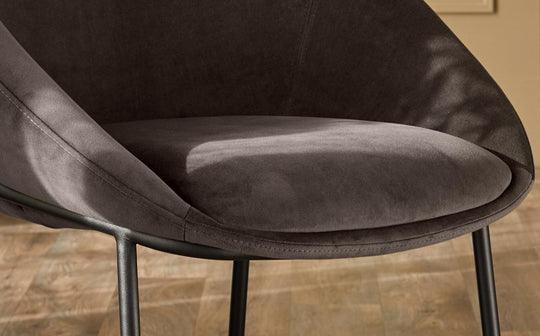 The Phoebe dark mocha velvet dining chair brings together comfort and style with its distinctive wraparound design. Exclusively designed for Danetti, this statement piece features cushioned comfort that embraces you during long dinner parties and lazy Sunday lunches. The rich mocha recycled velvet pairs beautifully with the sleek black metal legs, creating a sophisticated look that works with wood, glass or metal dining tables.
