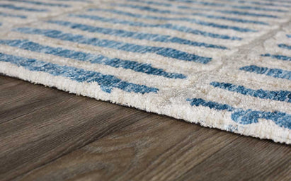 The Raine cream and blue textured large rug brings contemporary style to your floors with its striking geometric pattern and luxurious feel. This generously sized rug features a linear, broken stripe design that adds visual interest while the high/low pile creates beautiful texture underfoot. Perfect for living rooms, bedrooms or home offices where you want both comfort and style.