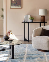 Contemporary living room showcasing a round glass coffee table with a unique black base, a sleek black console table adorned with books and a modern lamp, and a cosy beige armchair with a dark throw pillow. A striped blue and white area rug anchors the space.