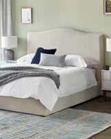 Elegant bedroom furniture set featuring an upholstered king-sized bed in a neutral beige fabric with curved corners on the headboard, flanked by two contemporary white nightstands with sleek metallic handles. A textured blue and beige area rug rests on the floor, complementing the serene and sophisticated decor.