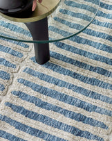 Textured area rug with beige base and blue stripe pattern, partially rolled up to reveal a black anti-slip underlay, on a wooden floor.
