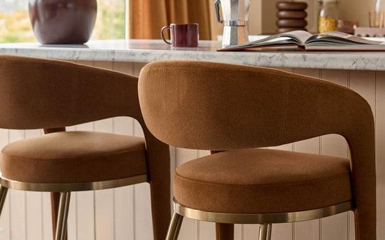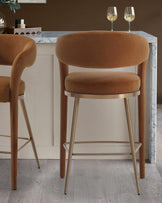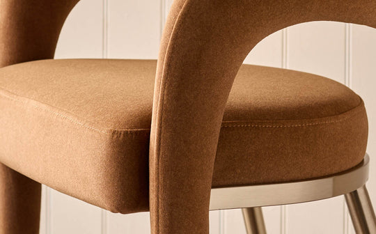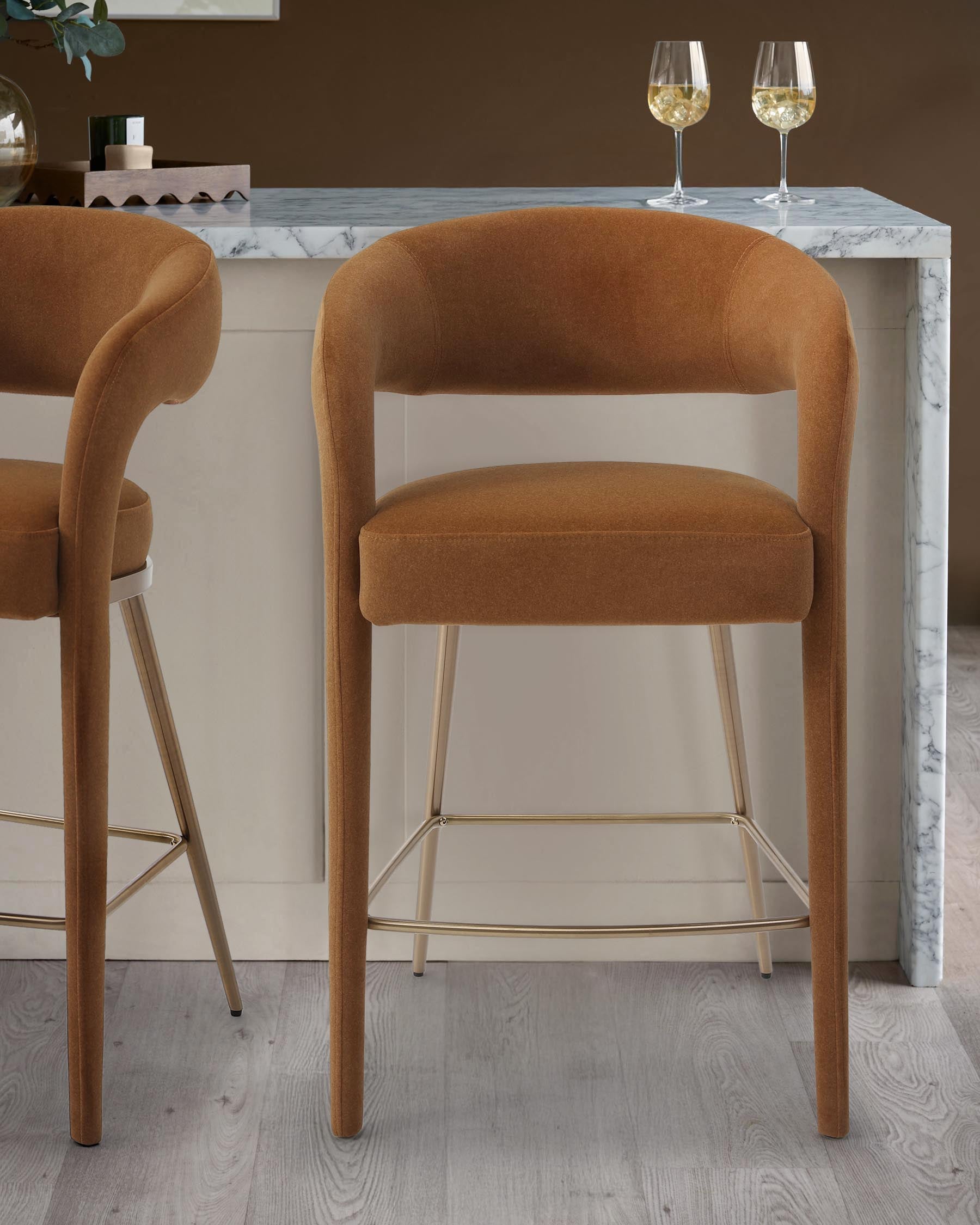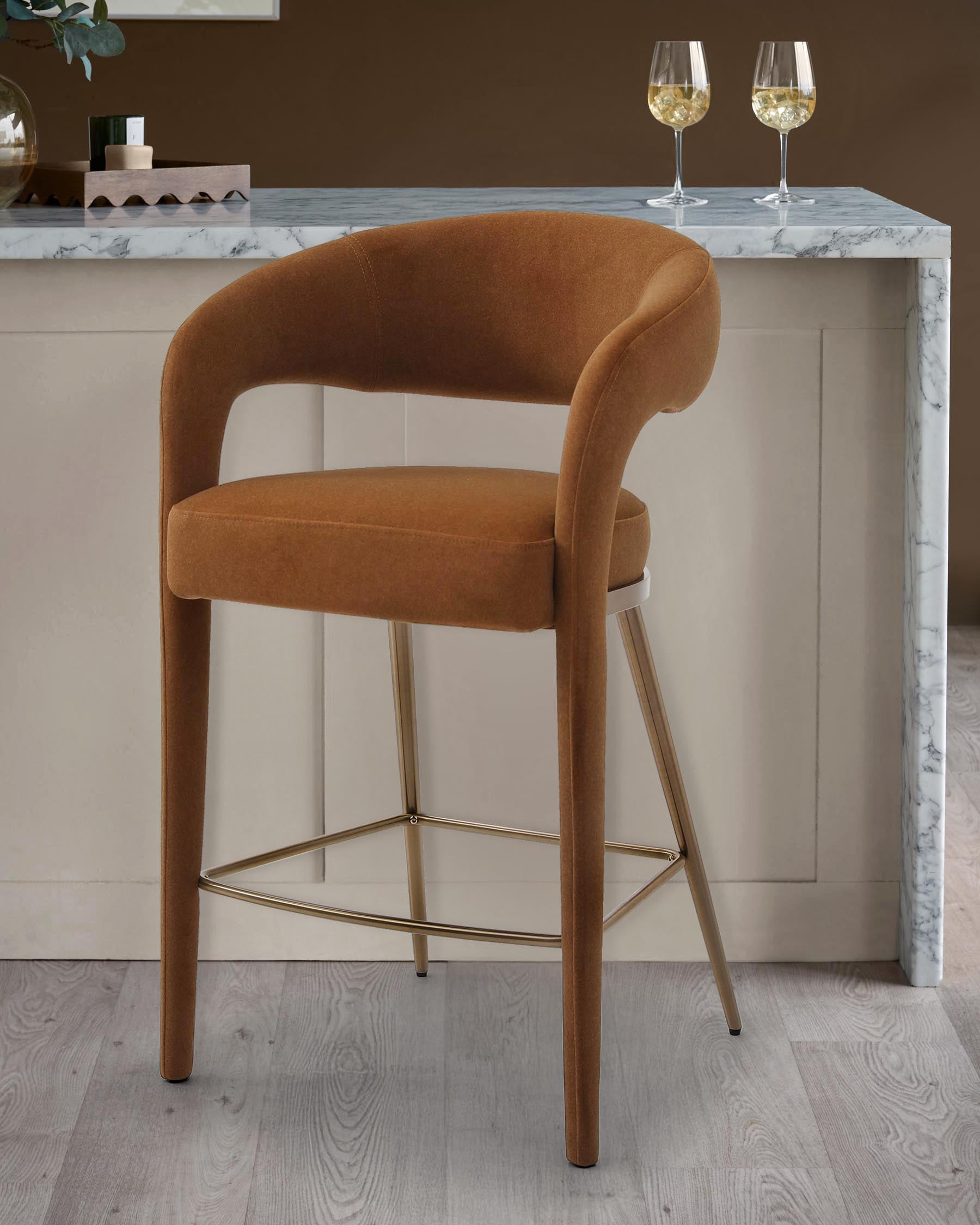 The Rhett caramel fabric bar stool brings sophisticated comfort to your breakfast bar with its curved backrest and plush upholstery. Brushed bronze-capped legs add a luxurious touch, while the asymmetrical design creates visual interest. Perfect for morning coffee or evening entertaining, this fixed-height stool combines style with exceptional support for those lingering conversations.