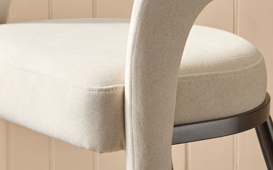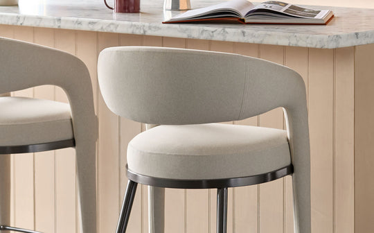 The Rhett cream fabric bar stool brings sophisticated comfort to your breakfast bar with its distinctive design. Fully upholstered front legs in smooth cream fabric create a striking silhouette, while the curved backrest with cut-out detail adds architectural interest. A foam and fibre combination ensures exceptional comfort for leisurely morning coffees or evening gatherings.
