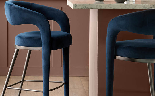 The Rhett dark navy velvet bar stool brings sophisticated comfort to kitchen islands and breakfast bars. Deep cushioning in both seat and backrest creates the perfect perch for morning coffee or evening conversations. Rich navy velvet upholstery adds warmth and texture, while the unique design combines fully upholstered front legs with sleek black steel back legs for a striking visual balance.