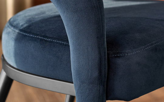 The Rhett dark navy velvet dining chair brings depth and sophistication to everyday gatherings. Deep cushioning across the seat and backrest creates an inviting sit that encourages long dinners and easy conversations. Rich velvet upholstery meets a confident architectural frame - fully upholstered front legs soften the silhouette while contrasting black steel back legs add contemporary edge.