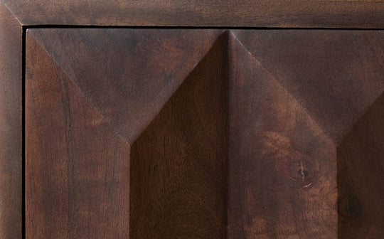 The Ria dark mango wood bedside table is designed for the way you actually live, bringing thoughtful craftsmanship and everyday ease to the bedroom. Made from solid dark mango wood, it celebrates natural grain and rich warmth while feeling reassuringly robust and built to last. Two generously sized drawers open with a smooth push to open mechanism, keeping the silhouette clean and effortless while offering practical storage for real life essentials. The intricately carved geometric front adds sculptural depth and texture, transforming a functional piece into a quiet design statement beside the bed. Carefully balanced proportions allow Ria to sit comfortably in modern, rustic and contemporary spaces, pairing beautifully with soft upholstery or crisp linens. Created in small, considered runs, this bedside table is tough enough for daily living yet refined enough for your best moments, where life gathers and mornings begin slowly with quiet confidence and effortless, enduring presence.