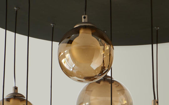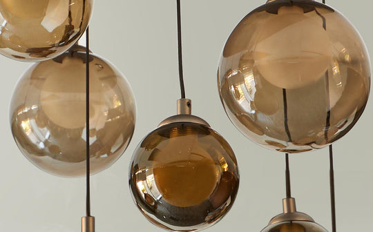 Transform your dining space with the Riley mocha glass 12 LED pendant light. Twelve hand-blown glass orbs in warm mocha tones cascade from an extra-large ceiling rose, creating a stunning focal point. With fully adjustable cables, you can customise the drop height to suit your space perfectly - whether that's above your dining table or as a statement piece in your living room.
