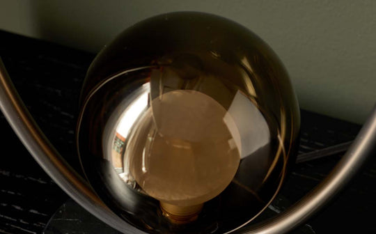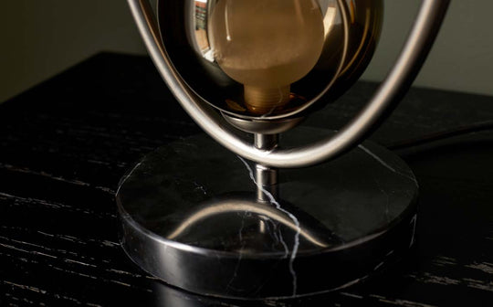 Transform your space with the Riley mocha glass 2 light table lamp - where contemporary design meets warm ambience. This exclusive Danetti piece features two hand-blown mocha glass orbs that cast a soft, diffused glow, perfect for creating intimate moments in your living room, bedroom or hallway. The striking satin nickel oval frame and luxurious black marble base add sophisticated style to any surface.