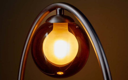 - Two hand-blown mocha glass orbs for warm, diffused lighting