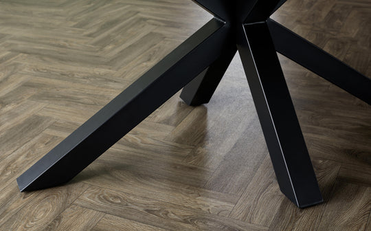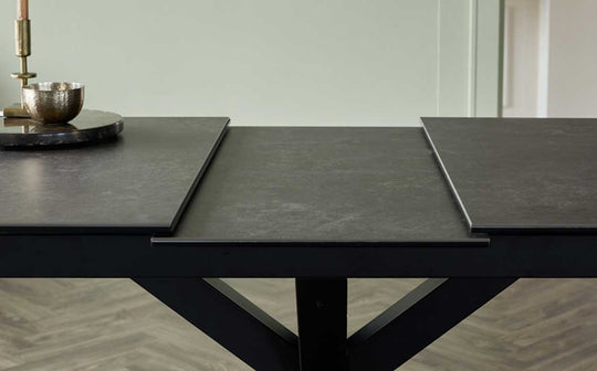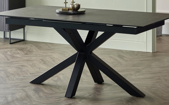 Make every meal memorable with the Riley dark grey ceramic extending 8 to 10 seater dining table. Its striking starburst pedestal base creates visual drama while maximising legroom for comfortable seating. The scratch and heat-resistant ceramic top features a sophisticated marble-effect finish that stands up to daily life. When guests arrive, simply slide out the smooth extension mechanism to seat up to 10 people comfortably.