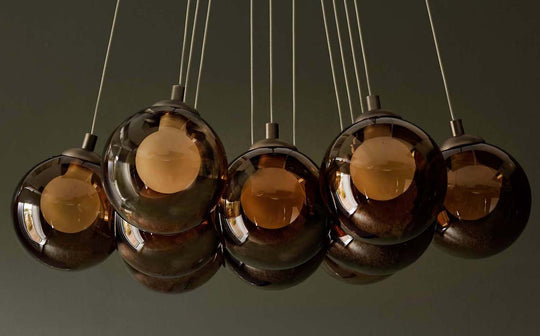 Transform your space with the Riley mocha glass LED cluster pendant - where modern sophistication meets artisan craftsmanship. This striking chandelier features 13 hand-blown glass orbs in warm mocha tones, creating a captivating focal point above your dining table or kitchen island. The energy-efficient integrated LEDs cast a warm, inviting glow perfect for gatherings that matter.