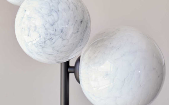 Make a statement with the Riley marble look 4 light glass floor lamp. Each handcrafted glass ball features a unique marble effect, ensuring no two lamps are alike. The sleek matt black stem creates striking contrast against the organic glass patterns, while four lights cast a warm, ambient glow perfect for living rooms, bedrooms or reading corners.