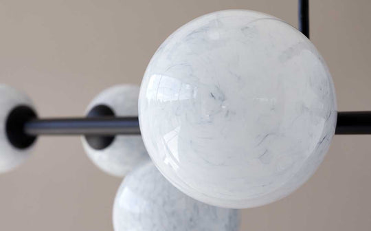 The Riley marble look glass 7 light horizontal pendant brings sculptural sophistication to your dining space. Seven hand-blown glass orbs, each with unique marble-effect patterns, cascade from a sleek matt black steel frame. The adjustable telescopic arm lets you customise the height and create tiered arrangements, while the spherical shades cast a soft, ambient glow perfect for intimate dinners or lively gatherings.