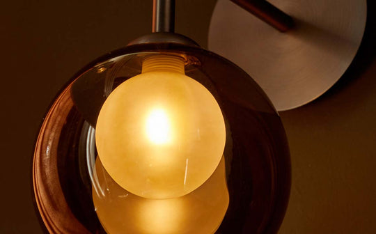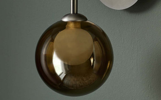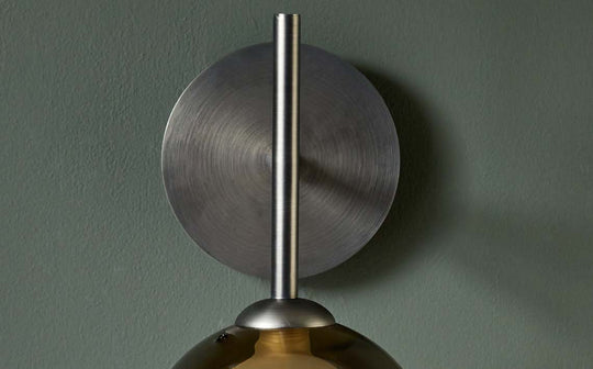 Cast a warm, sophisticated glow with the Riley mocha glass wall light. Its hand-blown double orbs in rich mocha glass create beautiful ambient lighting, while the sleek satin nickel frame adds contemporary polish. Perfect for hallways, bedrooms or living spaces, this exclusively designed piece brings modern luxury to any wall.
