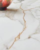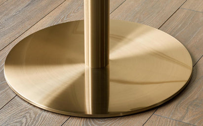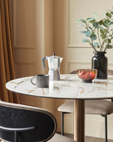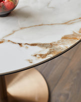 The Romeo natural ceramic 4 seater dining table makes a statement with its striking pedestal design. The natural white ceramic top offers the luxurious look of marble with practical durability - heat resistant and scratch resistant for everyday dining. The gleaming brushed brass pedestal base creates an elegant contrast, while the round shape encourages conversation and connection over meals.