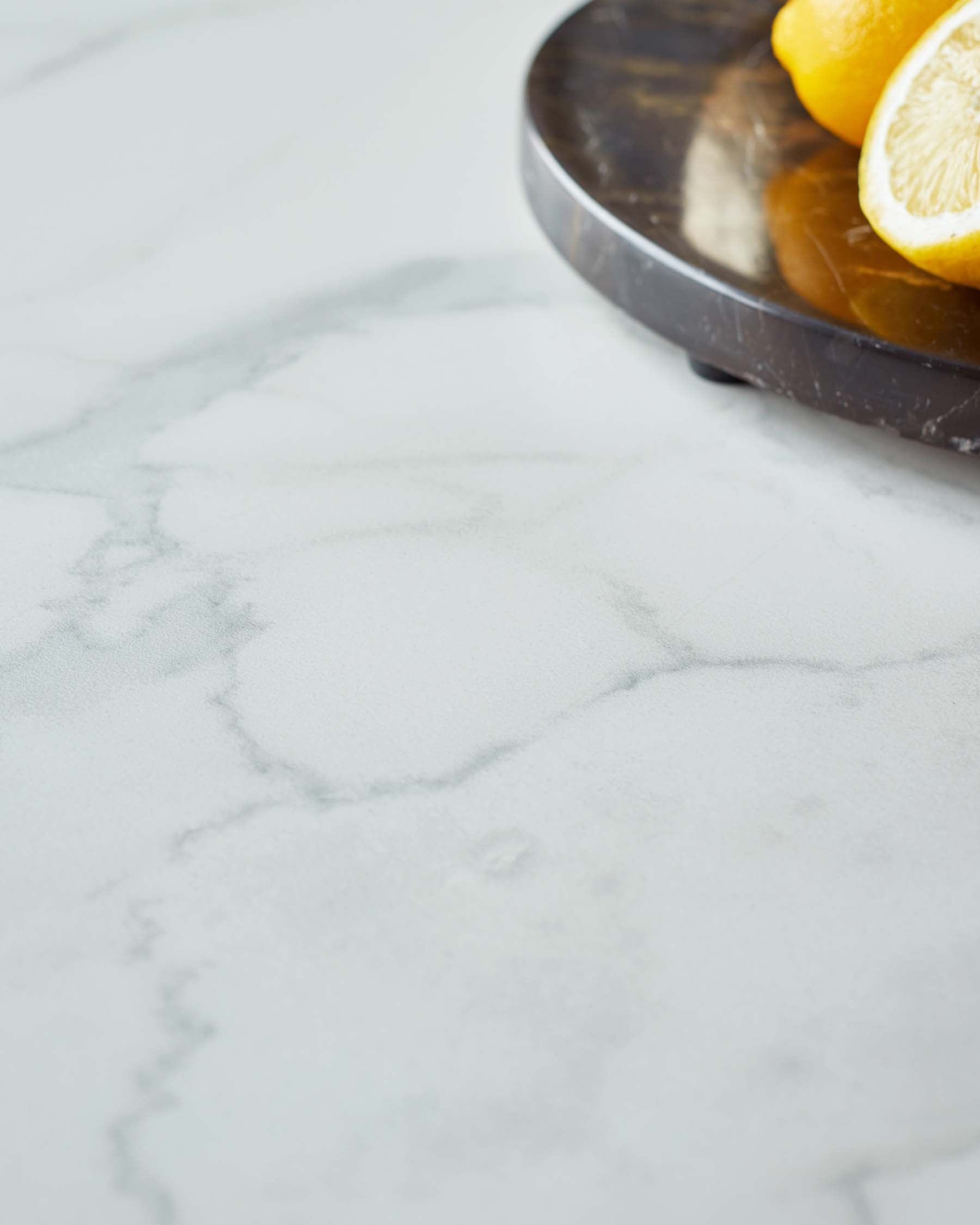 A smooth, light marble table surface with subtle veins, featuring a round dark platter holding fresh lemons.