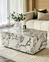 Effortlessly sophisticated, the Russo white calacatta ceramic coffee table brings modern luxury to your living space. Its striking cubic design and marble-effect ceramic surface create a centrepiece that's both beautiful and built for real life. Place hot drinks directly on the heat-resistant surface, knowing spills wipe away easily from this practical yet stunning piece.