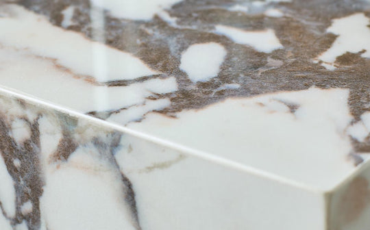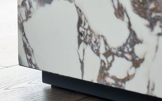 The Russo white Calacatta ceramic side table brings Italian-inspired sophistication to any corner of your home. Its striking ceramic top features natural veining that catches the light beautifully, while the sleek black plinth base adds contemporary contrast. Perfect beside your sofa for evening drinks or as a bedside companion, this compact piece combines luxurious looks with practical durability.