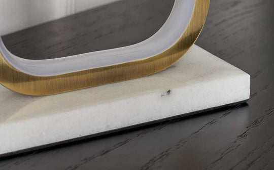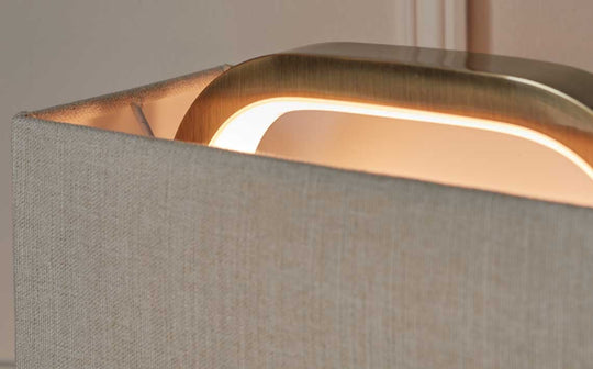 The Sanza table lamp brings understated sophistication to any surface. Its distinctive U-shaped brushed brass stand rises from a genuine marble base, creating a striking silhouette that works beautifully on bedside tables, console tables or styled amongst books. The natural linen-look shade casts a soft, warm glow perfect for creating ambience in bedrooms, living rooms or hallways.
