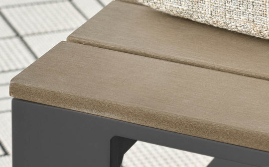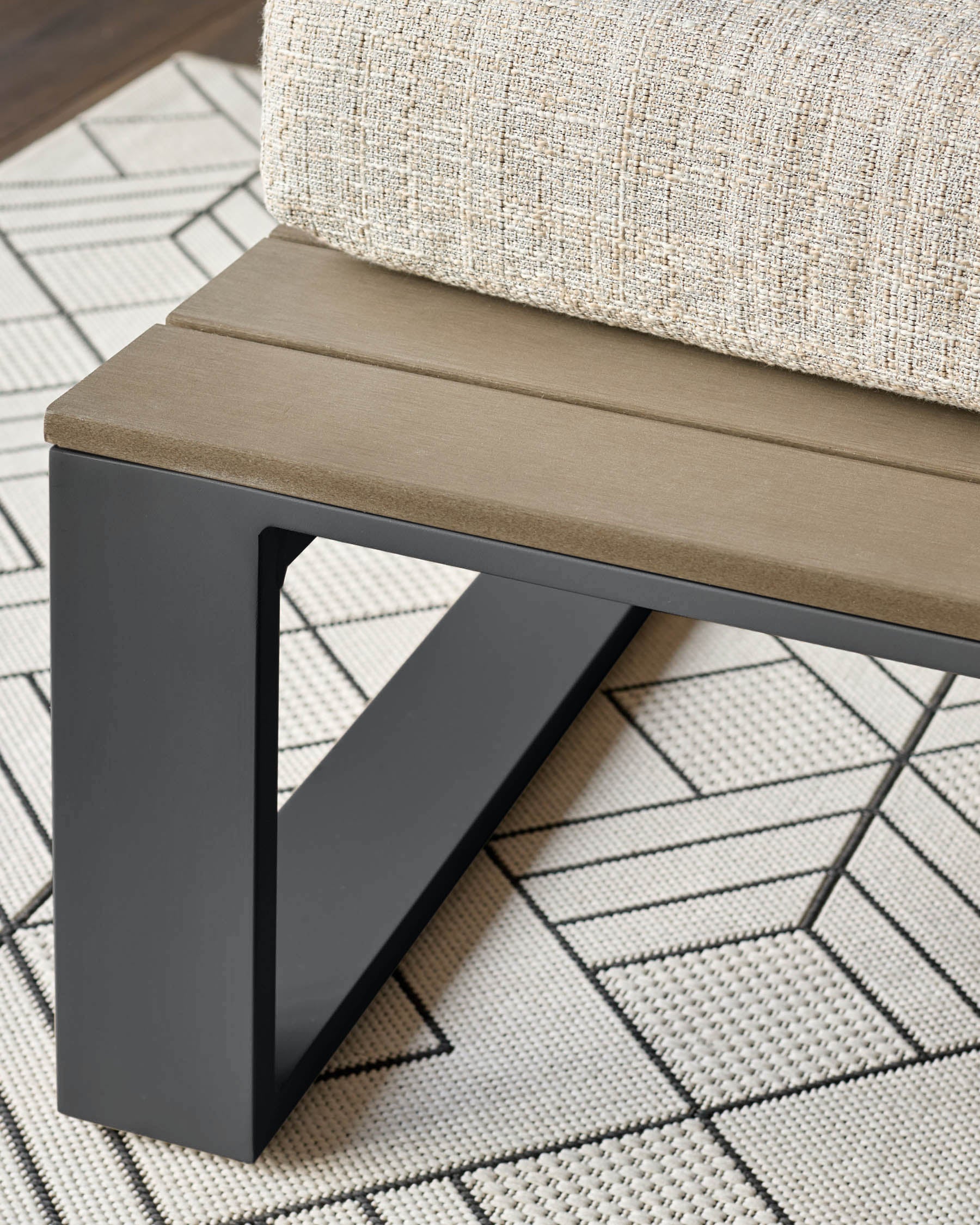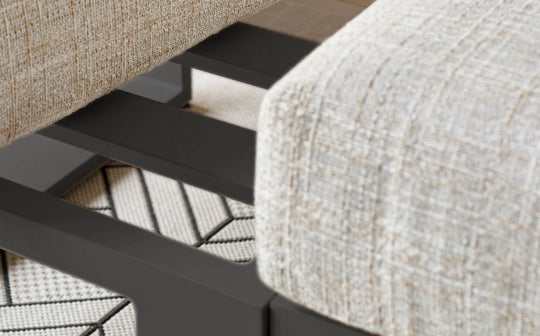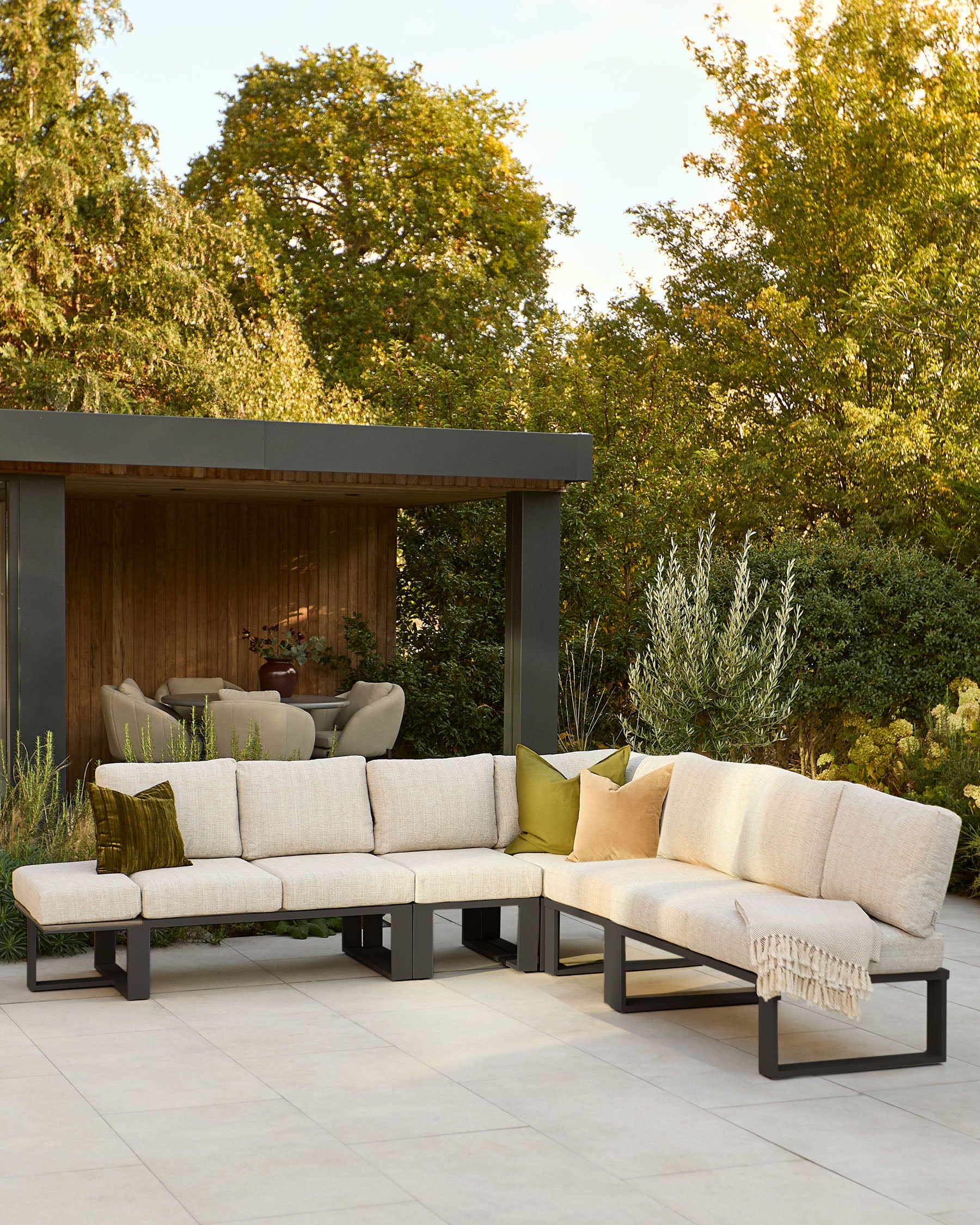 The Savannah black garden extra large corner bench brings sophisticated outdoor lounging to your space. Seating up to 7 people, this modular design features a sleek black powder-coated metal frame paired with natural flat weave and neutral cushions. The left-facing integrated side table doubles as extra seating or a chaise with the included cushion, offering versatility for every gathering.