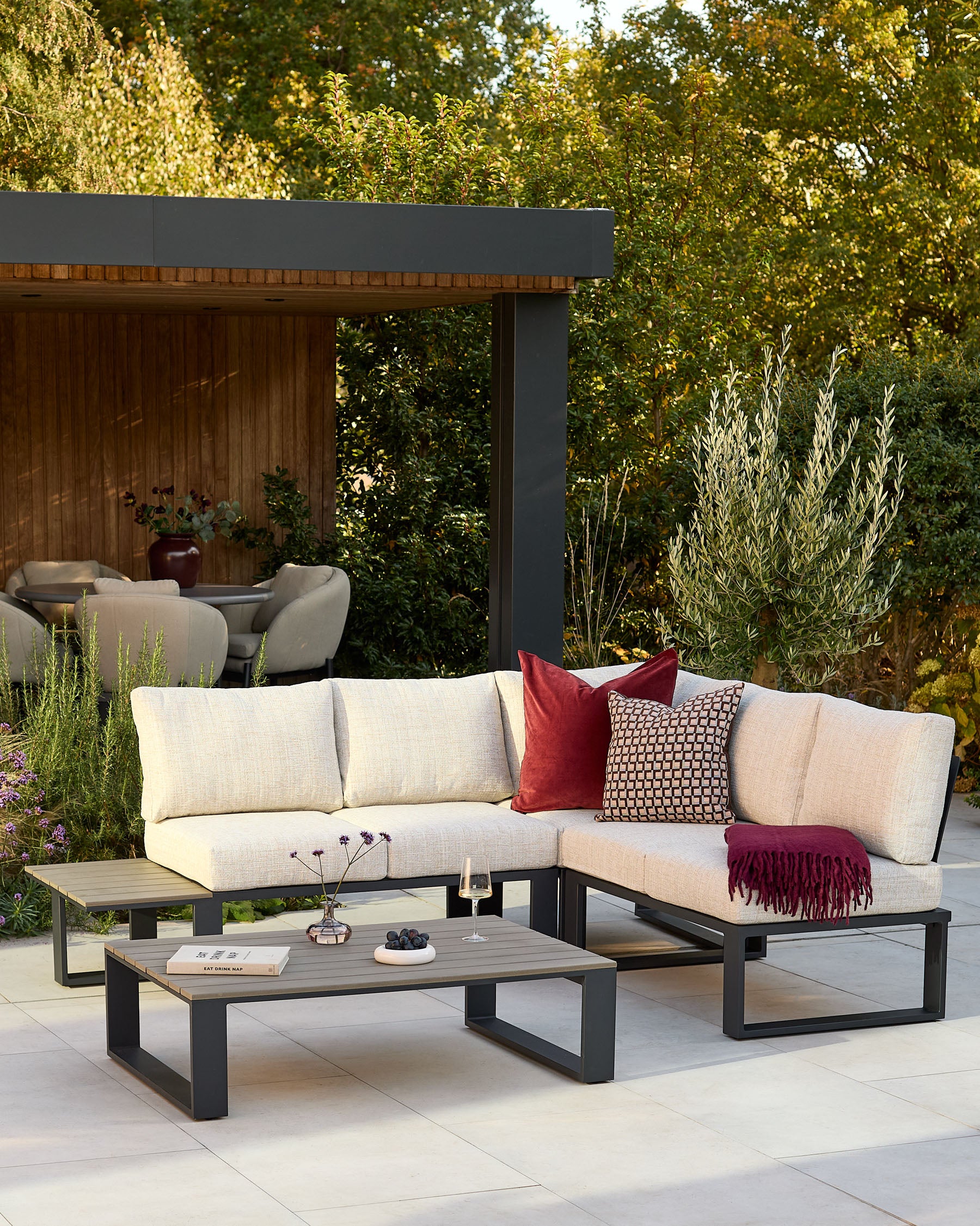 Create your perfect outdoor retreat with the Savannah black garden large corner bench and coffee table set. This sophisticated modular design seats 5 comfortably, featuring a sleek black powder-coated frame paired with natural flat weave and neutral cushions. The integrated left-facing side table and matching coffee table provide surfaces for drinks and dcor, making this set ideal for entertaining or relaxing in style.