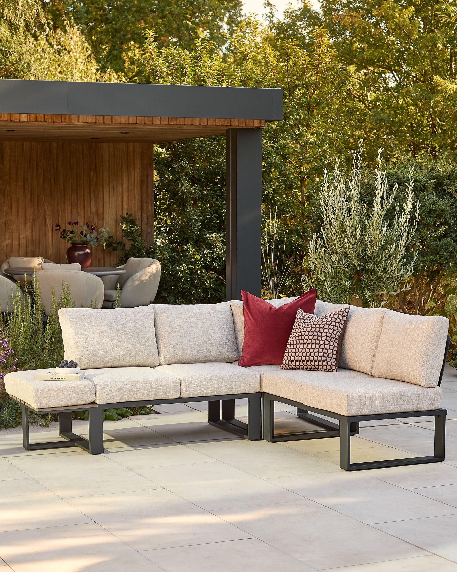 The Savannah black garden large corner bench brings modern sophistication to outdoor spaces with its striking black powder-coated frame and natural flat weave finish. Seating 5 comfortably, this modular design features a clever left-facing integrated side table that doubles as extra seating with its included cushion. Perfect for garden parties or quiet afternoons, the weather-resistant materials and plush cushions ensure comfort through every season.