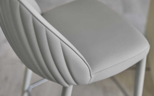 The Saylor dark grey faux leather bar stool brings sophisticated seating to your kitchen island or breakfast bar. With its curved back featuring elegant vertical stitching and fully upholstered legs, this fixed-height stool combines contemporary style with practical comfort. The durable faux leather finish makes it perfect for busy kitchens where spills happen and style matters.