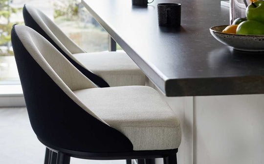 The Scarlett black mixed material bar stool brings contemporary style to your kitchen island or breakfast bar. Its two-toned upholstery combines smooth woven fabric with a luxuriously soft cushioned seat and curved backrest for lasting comfort. Sleek black ash wood legs provide durability and sophistication, making this the perfect perch for morning coffee or evening conversations.