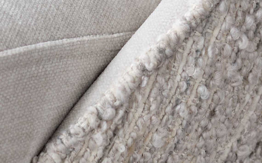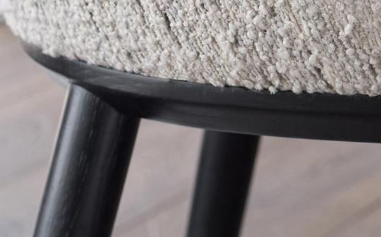 The Scarlett cream boucle and natural grey chenille dining chair brings textural sophistication to your dining space. This thoughtfully designed chair combines tactile cream boucle on the back with smooth, velvet-like grey chenille on the inner seat. Gently curved for comfort and support, it's perfect for long dinner parties or quick morning coffees. The solid black wooden legs create a striking contrast against the soft, neutral upholstery.