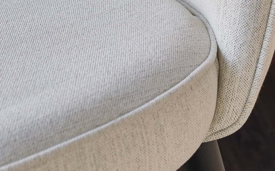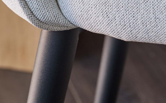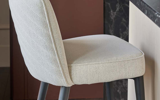 The Serena ivory dual tone fabric bar stool brings sophisticated comfort to your kitchen island or breakfast bar. Upholstered in soft chenille with elegant chevron stitching, this fixed-height stool features a generously padded seat and backrest. Dark powder-coated steel legs create a striking contrast while the built-in footrest ensures relaxed seating for long conversations over morning coffee or evening drinks.