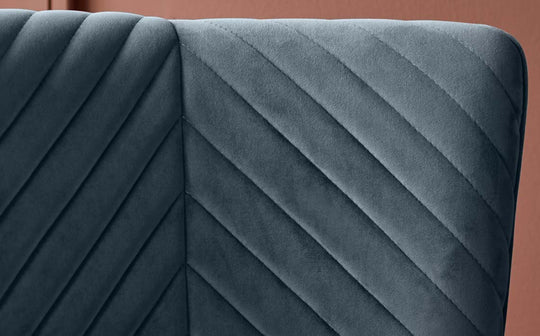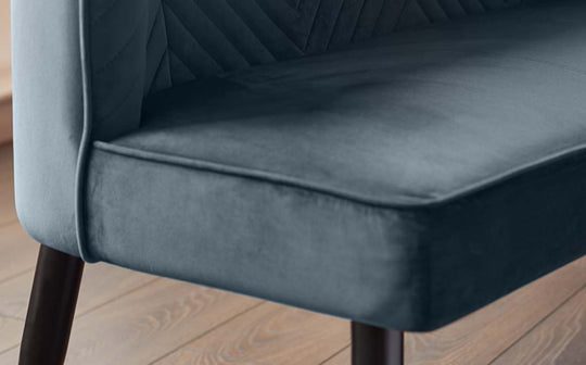 The Serena blue grey velvet 3 seater dining bench brings sophisticated seating to your dining space. Upholstered in plush velvet with chevron-quilted backrest detailing, this bench seats 3 comfortably while adding a luxurious touch. Perfect for creating intimate dining arrangements or as statement seating in hallways and living spaces.