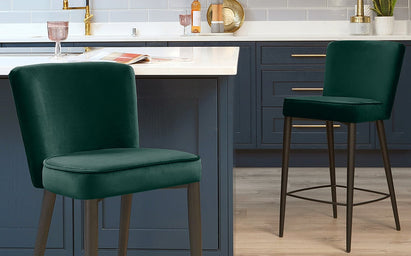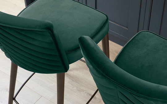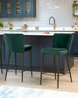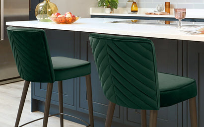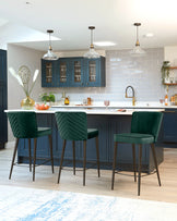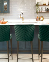 The Serena Dark Green Velvet Bar Stool brings sophisticated style to kitchen islands and breakfast bars. Its striking quilted chevron back creates visual interest, while plush dark green velvet upholstery offers luxurious comfort for leisurely morning coffees or evening aperitifs. The powder-coated metal legs in matching dark green provide sturdy support with a cohesive, refined finish.