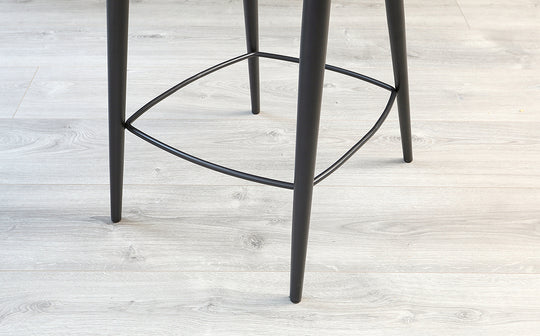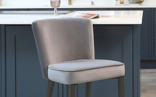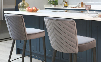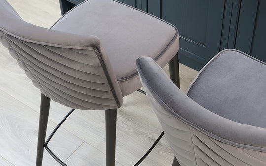 Bring sophisticated comfort to your kitchen island with the Serena dark grey velvet bar stool. Its plush velvet upholstery features eye-catching quilted chevron detailing that adds texture and visual interest. The fixed height design pairs perfectly with breakfast bars and kitchen counters, while slim splayed metal legs provide sturdy support without overwhelming your space.