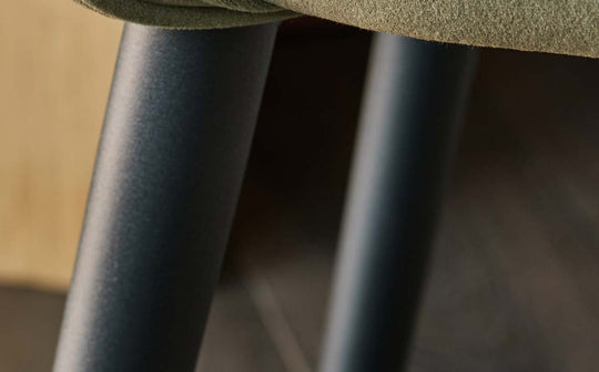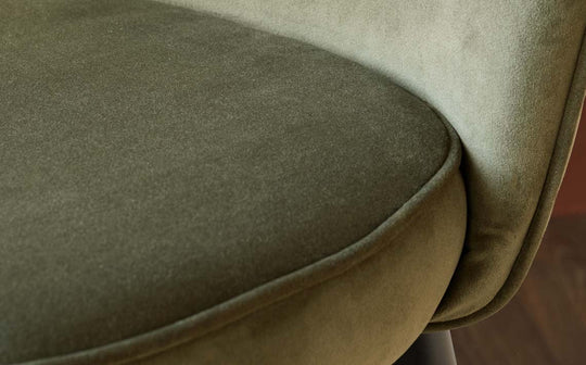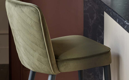 The Serena olive green velvet bar stool brings sophisticated comfort to your kitchen counter or breakfast bar. Upholstered in sumptuous recycled velvet with a subtle chevron stitch detail on the backrest, this fixed-height stool combines style with sustainability. Slim powder-coated steel legs and generous cushioning create the perfect perch for morning coffee or evening drinks with friends.
