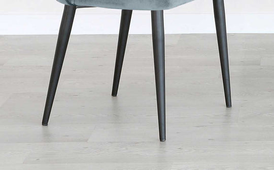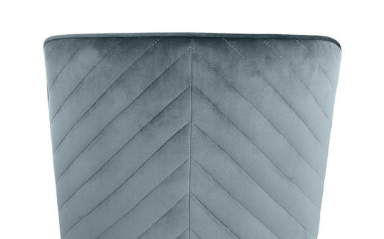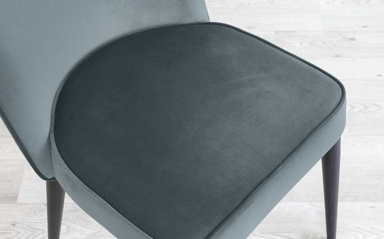 The Serena blue grey velvet dining chair brings sophisticated comfort to your dining space. Generously padded with chevron quilted detailing on the backrest, this chair offers both style and support for long dinner parties. The luxurious blue grey velvet upholstery sits atop sleek black powder-coated legs, creating a contemporary silhouette that works beautifully in modern and traditional settings alike.