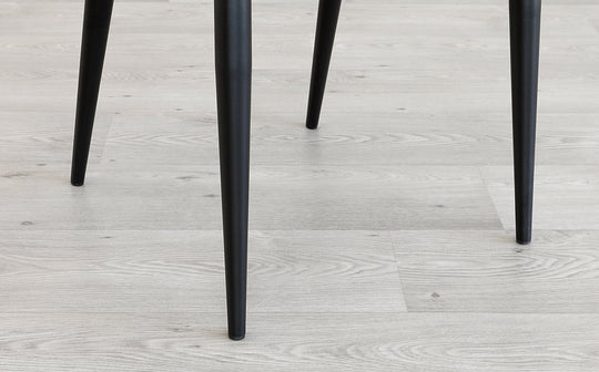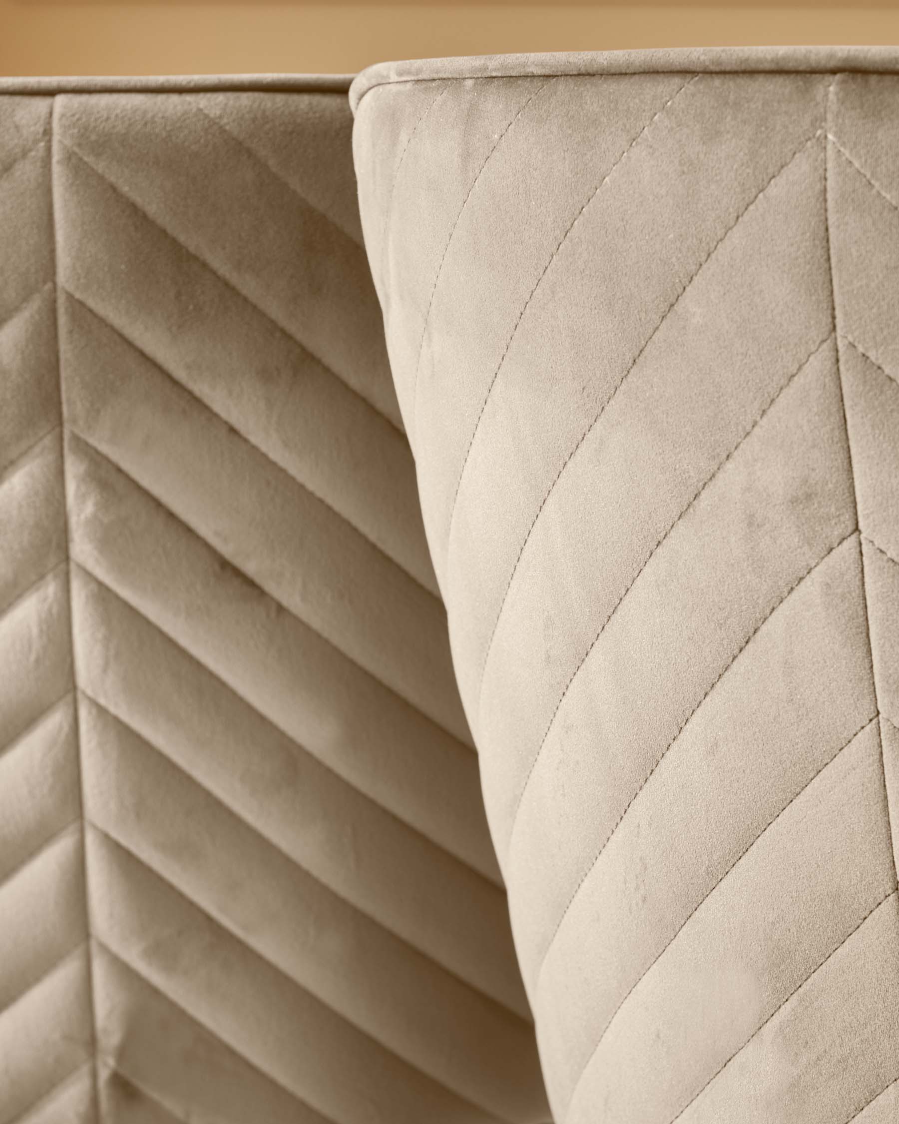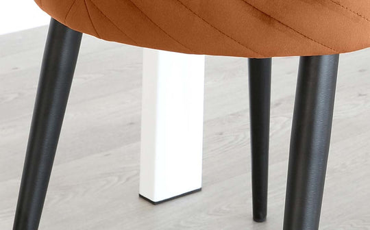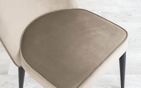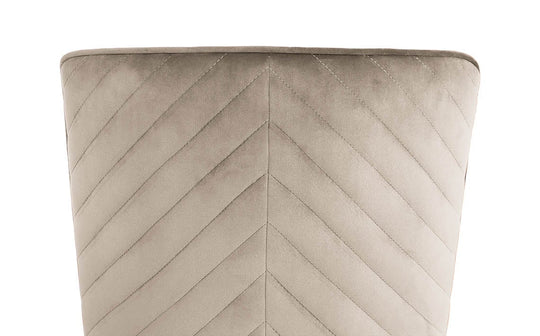 The Serena champagne velvet dining chair brings sophisticated comfort to your dining space. Upholstered in sumptuous champagne velvet with distinctive chevron stitching on the backrest, these chairs combine designer details with exceptional comfort. The generous cushioning and supportive backrest make lingering over dinner a pleasure, while sturdy black powder-coated metal legs provide lasting stability.