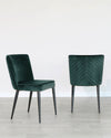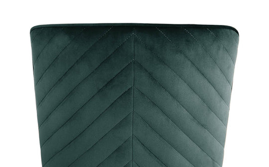 Transform your dining space with the Serena dark green velvet dining chair. This thoughtfully designed piece combines luxurious dark green velvet upholstery with distinctive chevron stitching for a sophisticated look. The generous cushioning and supportive backrest ensure comfort through those long dinner parties, while sleek black metal legs provide sturdy support for years to come.