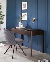 Modern home office furniture featuring a dark brown wooden desk with brass accents and a sleek grey upholstered chair with slender black metal legs.