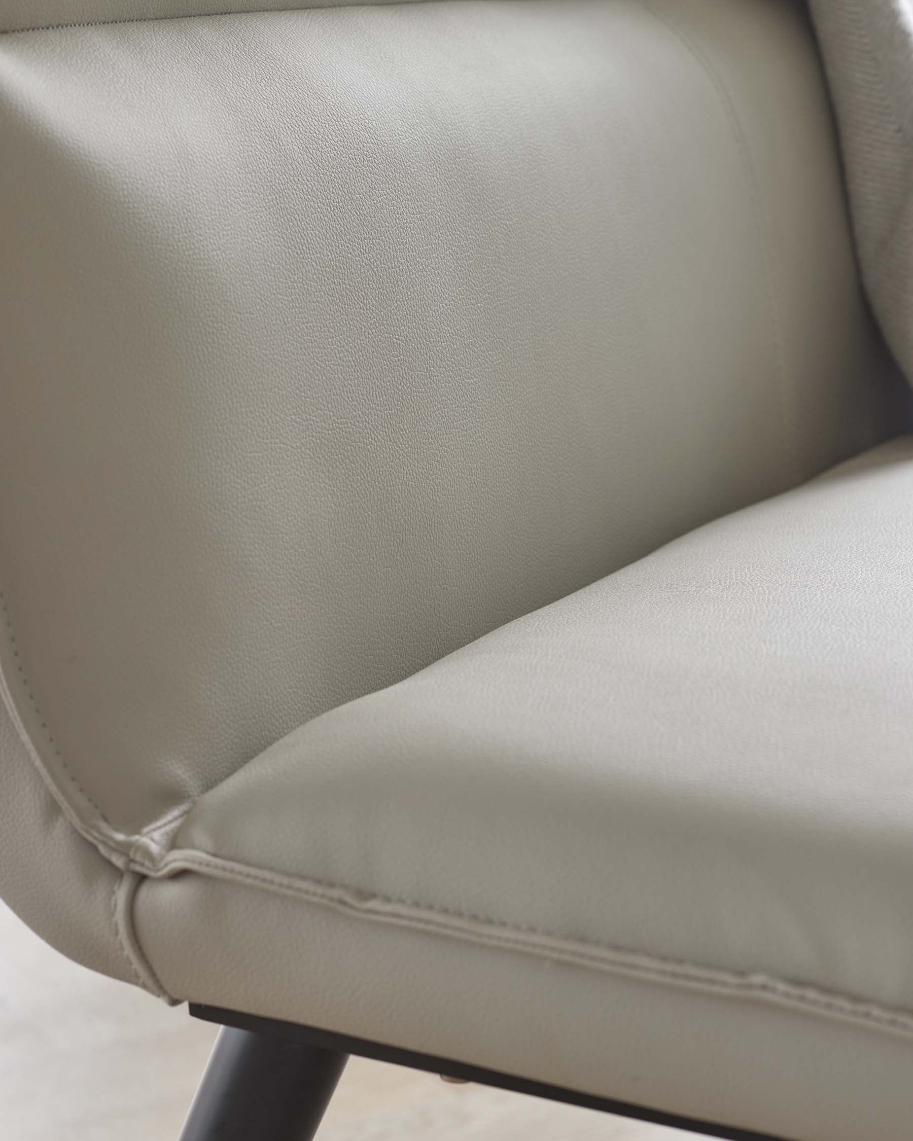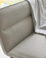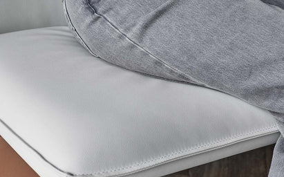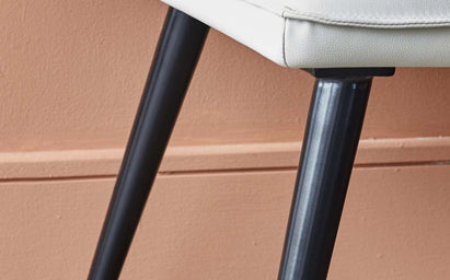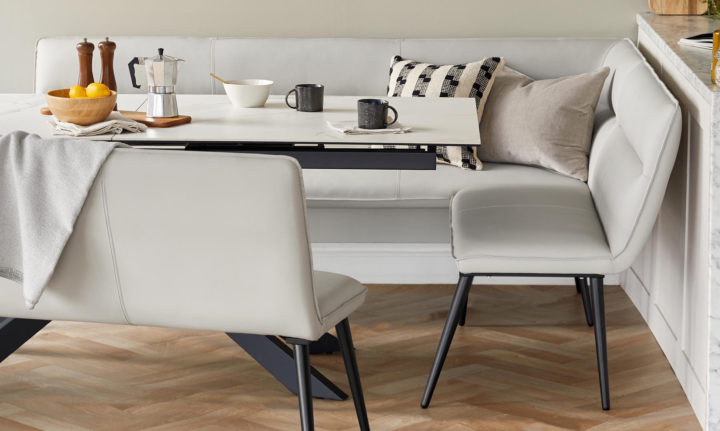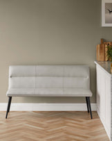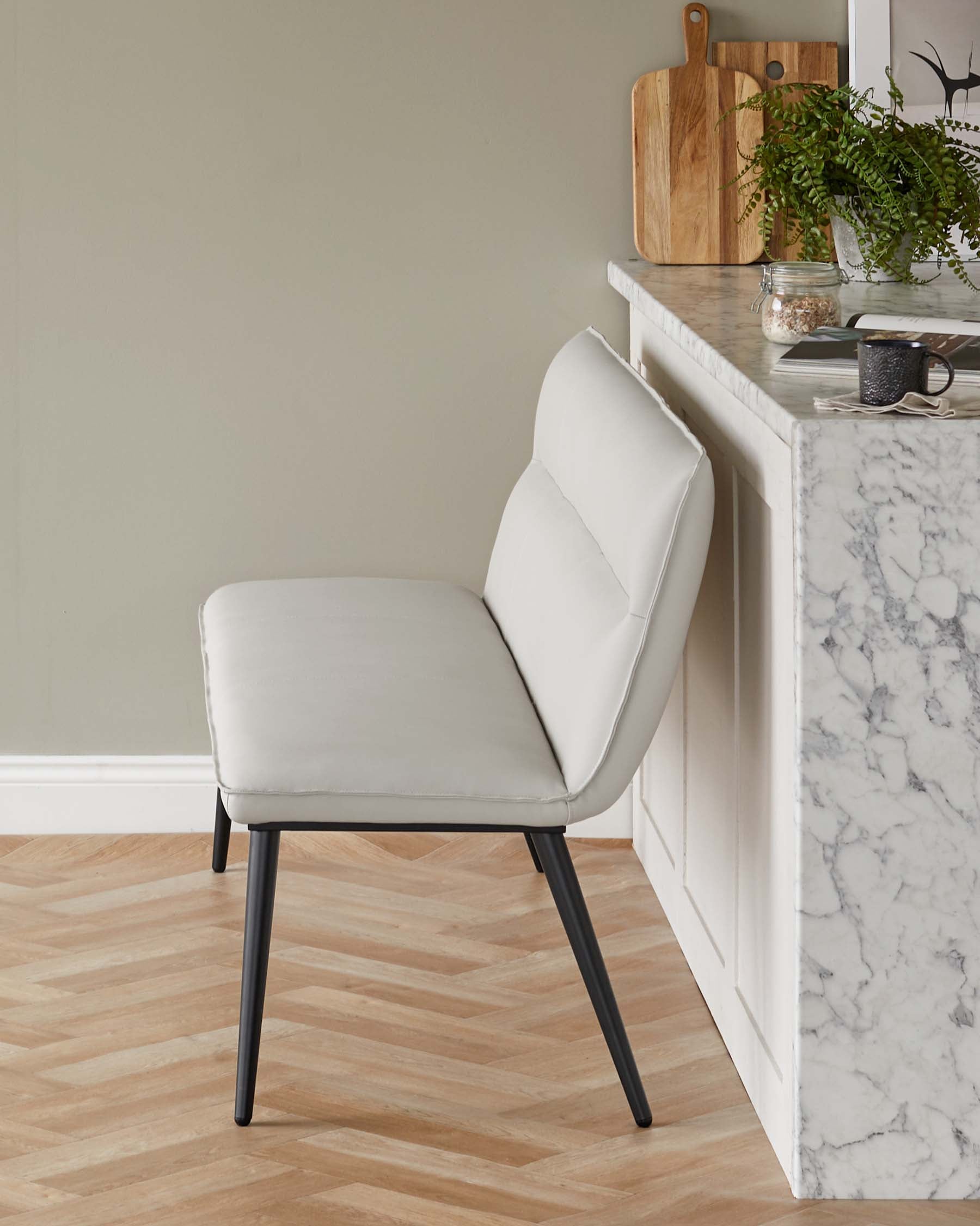 The Seth 3-seater dining bench effortlessly combines style and comfort, adding a touch of charm to any dining space. Upholstered in a luxurious light grey faux leather, it offers a soft, textured surface with an exquisite grain, ensuring lasting durability. The sleek, linear design features a backrest with subtle vertical channels that create a pleated effect, adding a touch of sophistication. Supported by a sturdy powder-coated steel frame and complete with built-in floor protectors, this bench provides both style and practicality. Create a cohesive look by pairing the Seth bench with a matching dining table and chairs, or opt for a contrasting table for a more eclectic feel. Introduce scatter cushions for added comfort and pops of colour or texture.Details
