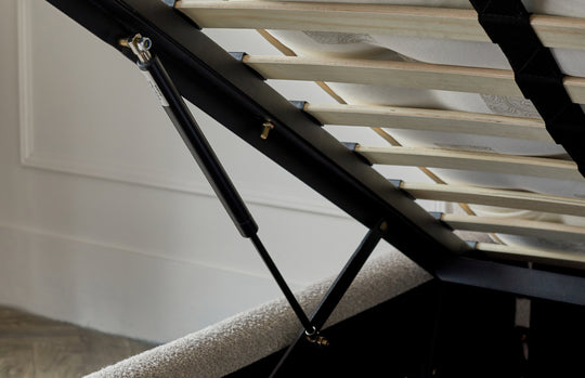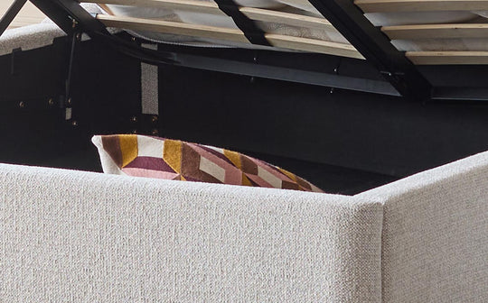 The Siesta natural fabric double ottoman storage bed combines comfort and clever storage in one beautifully designed piece. Upholstered in soft, chunky chenille with a tactile boucle texture, this bed features a plush pillow-back headboard perfect for bedtime reading. The gas-piston assisted ottoman base lifts effortlessly to reveal generous storage space for bedding and seasonal items, keeping your bedroom clutter-free.