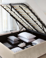 The Siesta champagne velvet double ottoman storage bed combines luxurious comfort with clever storage solutions. Its deep-cushioned headboard creates the perfect spot for reading or relaxing, while the sumptuous champagne velvet upholstery adds warmth and sophistication to your bedroom. Hydraulic pistons make accessing the generous ottoman storage effortless, keeping bedding and blankets neatly tucked away.