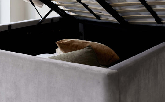 The Siesta king size bed is designed for pure comfort and relaxation. The deeply cushioned headboard provides the perfect spot to unwind, while the stylish toggle detailing and chrome corner feet add a touch of contemporary elegance. Upholstered in a luxurious grey velvet, this bed boasts a sturdy frame constructed with sprung slats and pre-assembled webbing, ensuring lasting support and durability. The ottoman storage base, operated by durable hydraulic pistons and featuring a hardboard base, effortlessly lifts to reveal a spacious compartment, ideal for keeping bedding, blankets, or out-of-season clothing neatly tucked away. Pair the Siesta with a premium mattress and coordinating bedside tables for a cohesive and restful bedroom sanctuary.Details
