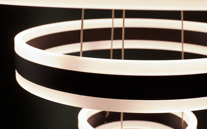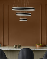 Make a statement with the Solana black metal adjustable pendant light. Three tiered concentric rings create a striking cascade effect that draws the eye upward, while integrated LED lighting casts a sophisticated glow across dining tables, kitchen islands or living spaces. The adjustable height lets you create the perfect drop for your room.