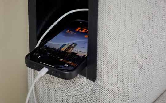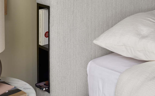 Upholstered bedhead in pale grey fabric with black built-in shelving containing books and a mobile phone.