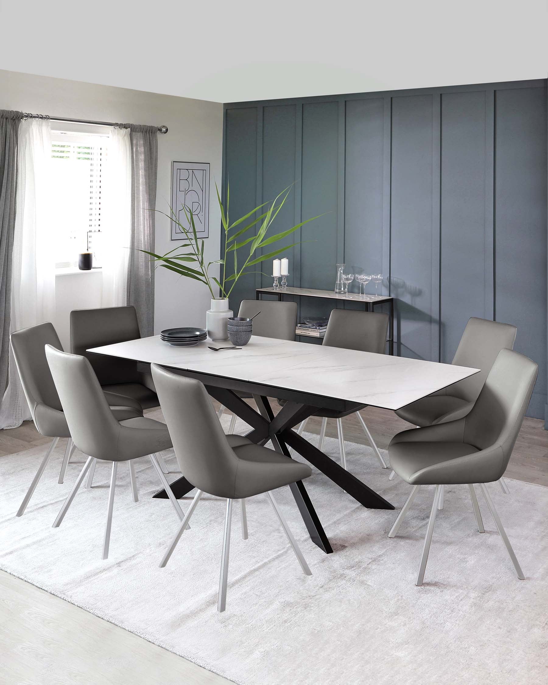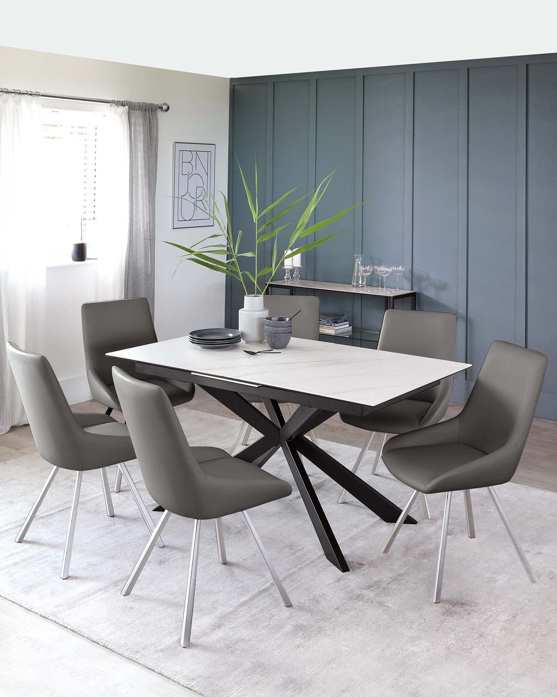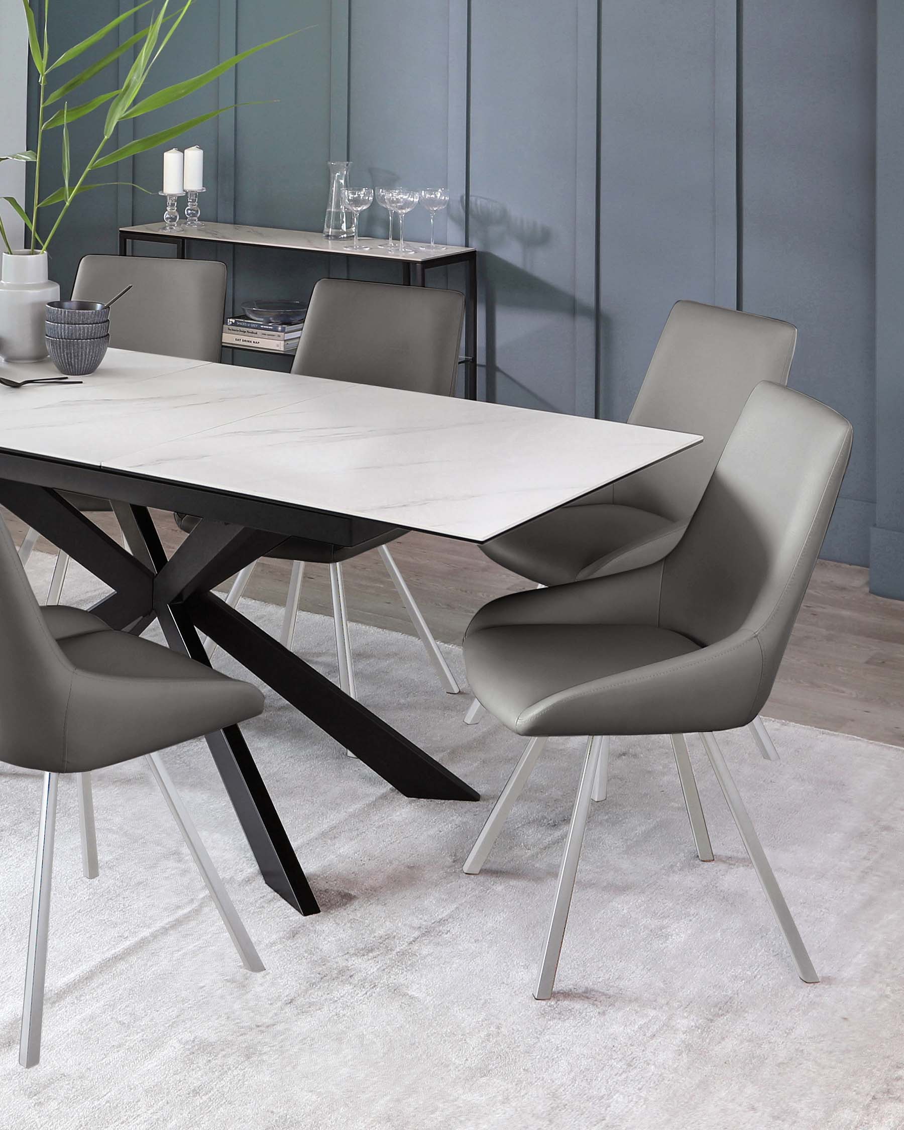 The Theo dark grey faux leather dining chair brings sophisticated comfort to mealtimes. Its gently curved backrest and padded seat create exceptional support, while the sleek brushed stainless-steel legs add contemporary style. Upholstered in premium Durosoft faux leather, these chairs are built for real life - tough enough for daily use, beautiful enough for dinner parties. Sold in pairs.