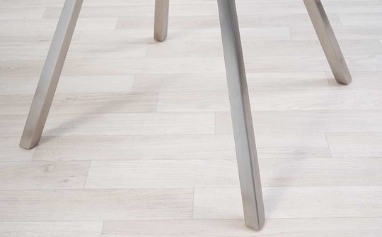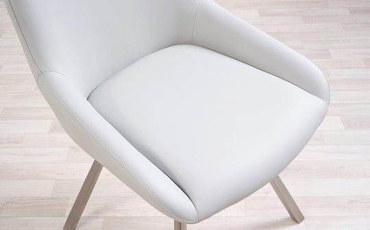 The Theo dining chair brings refined comfort to your dining space with its gently curved silhouette and plush padding that moulds to your body. Upholstered in soft, supple light grey faux leather with brushed stainless steel legs, this thoughtfully designed chair offers sophisticated style that works beautifully with contemporary glass tables or rich wooden dining sets.
