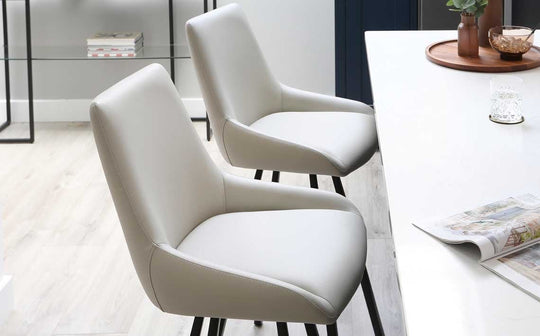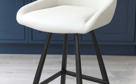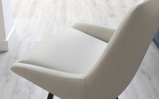 The Theo light grey faux leather swivel bar stool brings sophisticated seating to your breakfast bar or kitchen island. Its curved bucket seat, upholstered in soft faux leather with foam and fibre filling, offers exceptional comfort for morning coffees or evening gatherings. The clever self-righting 180deg swivel mechanism means it always returns to position, keeping your space looking perfectly arranged.