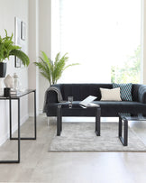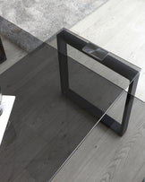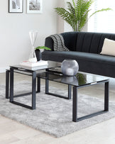The Tiva coffee table set is a stylish and practical addition to any contemporary living space. This set includes a spacious rectangular coffee table and a smaller nesting side table, both crafted with sleek smoked glass tops and durable black metal frames. The dark glass and black metal combination creates a sophisticated look, while the versatile design allows you to separate the tables for additional surface space when entertaining. Style the larger table with a curated selection of books, decorative bowls, or candles, and use the smaller table as a convenient spot for drinks or snacks. This set complements a variety of interior styles and pairs well with console tables, side tables, and a simple rug. Ideal for a living room or open-plan space, the Tiva coffee table set offers both functionality and modern elegance.Details