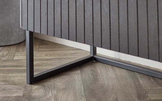 The Toronto dark ash TV stand brings sophisticated storage to your living space with its striking ribbed cabinet doors and sleek black metal legs. This contemporary piece offers generous hidden storage behind push-to-open doors, plus a velvet-lined drawer for remotes and accessories. At 160cm wide, it's perfectly proportioned for larger screens while maintaining a streamlined profile that works beautifully in modern homes.